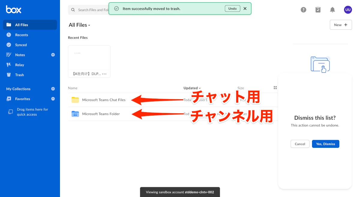 Teamsチャンネルからユーザーを削除した時の挙動ですが、Teamsチャネルで自動生成フォルダ(Box for Teamsがデフォルトで作成するもの)を使用している場合、該当メンバーは削除されます。仮にTeamsのゲストユーザーであっても、同様にTeamsから削除されたら、Boxから削除されます。