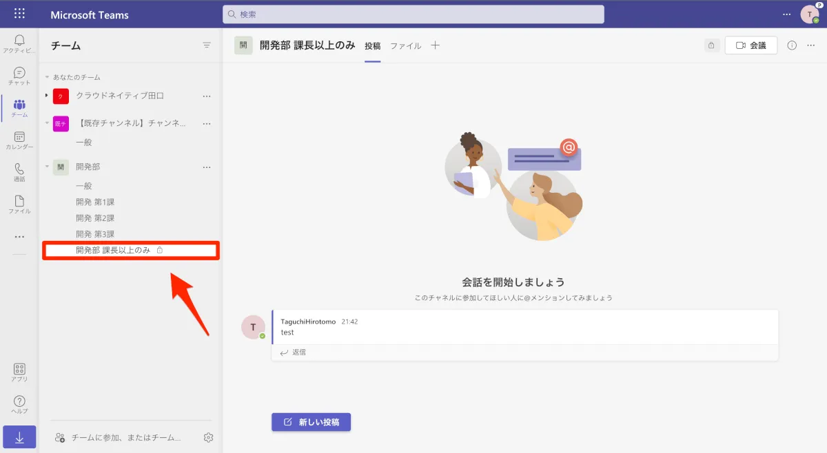 Teamsのよくある使い方として、「チーム」の中に「パブリックチャンネル」と「プライベートチャンネル」を共存させるという使い方があります。例えば、下の画像だと開発部という「チーム」の中に1課〜3課の「パブリックチャンネル」がある一方で、課長以上の偉い人だけの「プライベートチャンネル」も存在します。この「プライベートチャンネル」では、人事情報など、一般の人には見せてはいけない情報を取り扱っていたりもします。