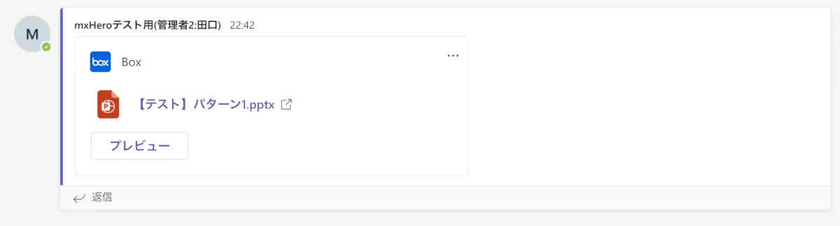 「Boxボタン」からアップロードしたファイルは、上の画像のように、Box上に格納されますので、通常の添付ファイルとは見え方が異なります。このファイルはTeamsアプリ上からプレビューできます。