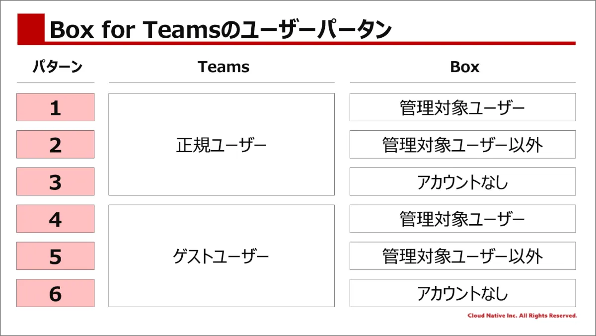 TeamsとBoxのユーザー種別には以下のようなパターンが考えられます。