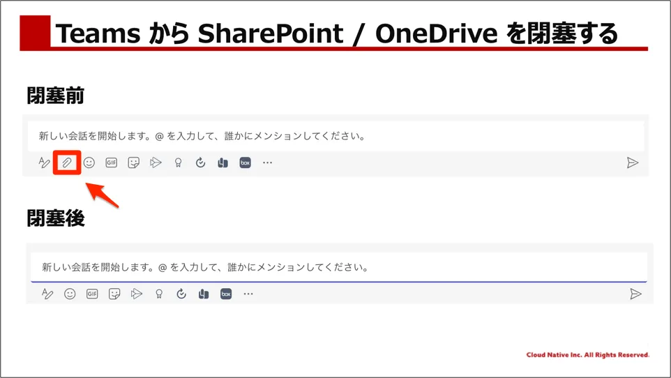 設定後しばらくすると、Teamsの文字入力画面から、ファイル添付のアイコンが消えます。これにより、Teamsから SharePoint / OneDrive にファイルアップロードができなくなります。
