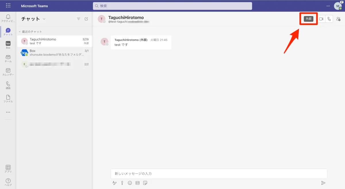 外部チャット機能においては、Box for Microsoft Teamsは利用できないようです。※そもそも、外部チャットにおいて、ファイル添付はサポートされていません。(参考)