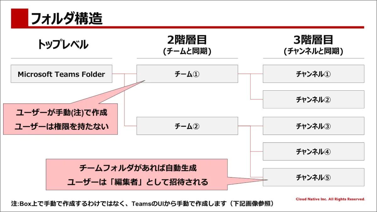 Boxにアップロードされたファイルや作成されたフォルダに対して、Box上でどのような権限が付与されるのかも気になるポイントです。v2.3.0においては、「アップロードしたユーザー」と「その他のユーザー」に関係なく、参加している「チャンネル」のフォルダとその中のファイルに対して「編集者」の権限が付与されます。