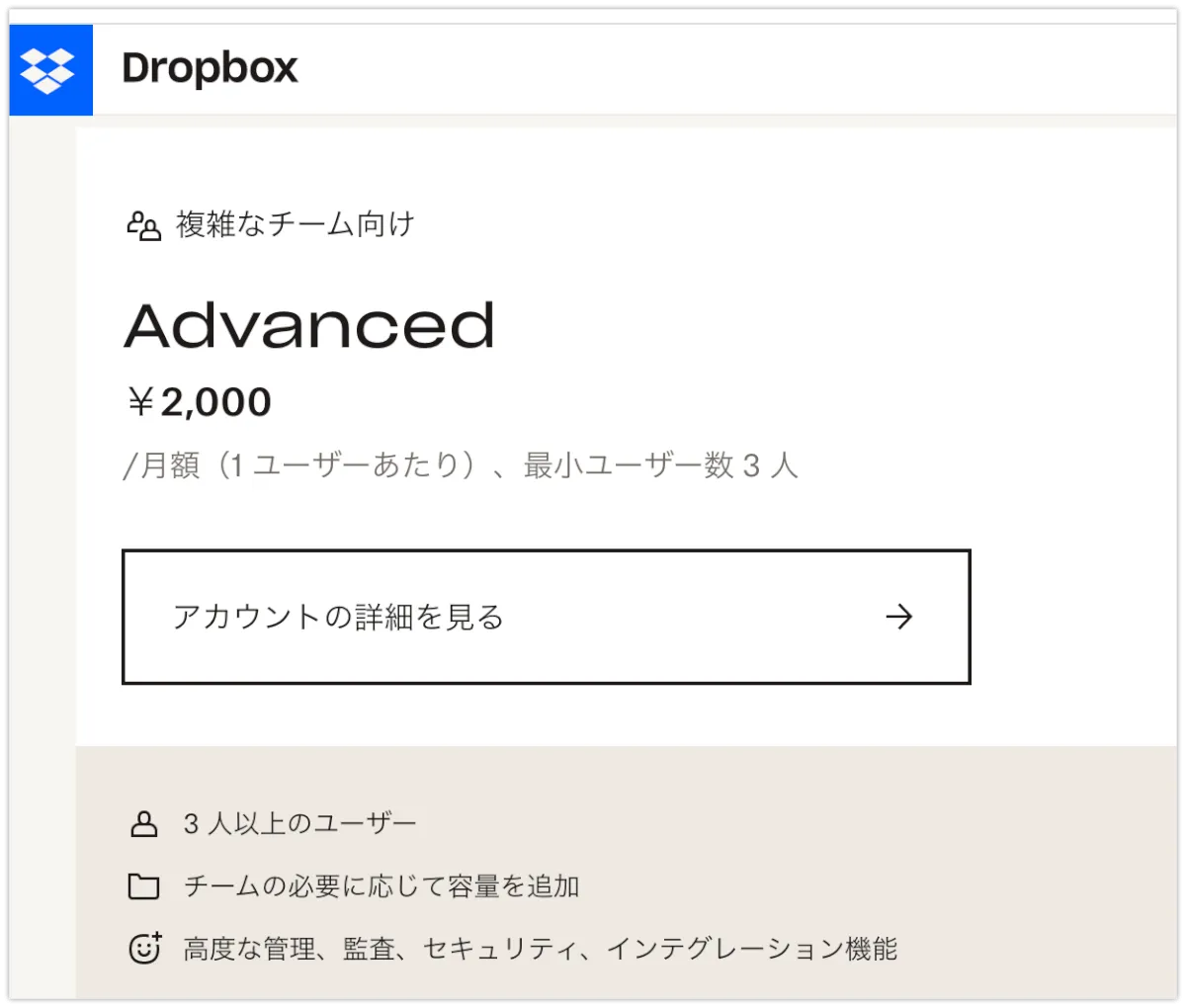 ※Standardの場合、最大容量が5TBまでです。よほど小規模でない限りはAdvancedプランがよいように思います。