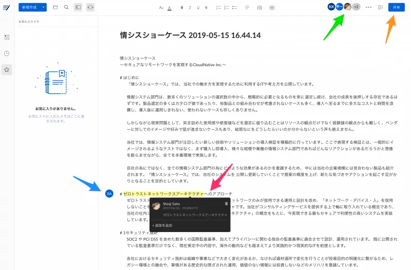 青矢印のように、誰がどこを今編集しているか位置を確認できるので、同時編集の事故が心配がありません。