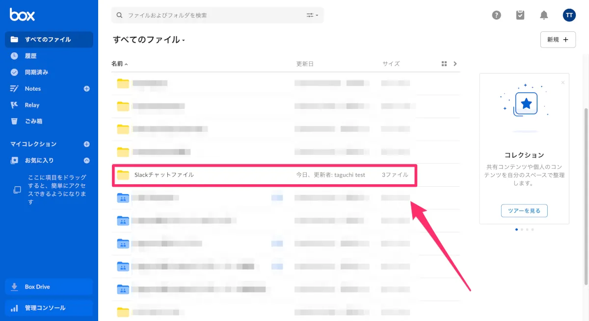 Box側では「Slackチャットファイル」というフォルダが生成され、Slackで共有されたフォルダが順々に保管されていきます。