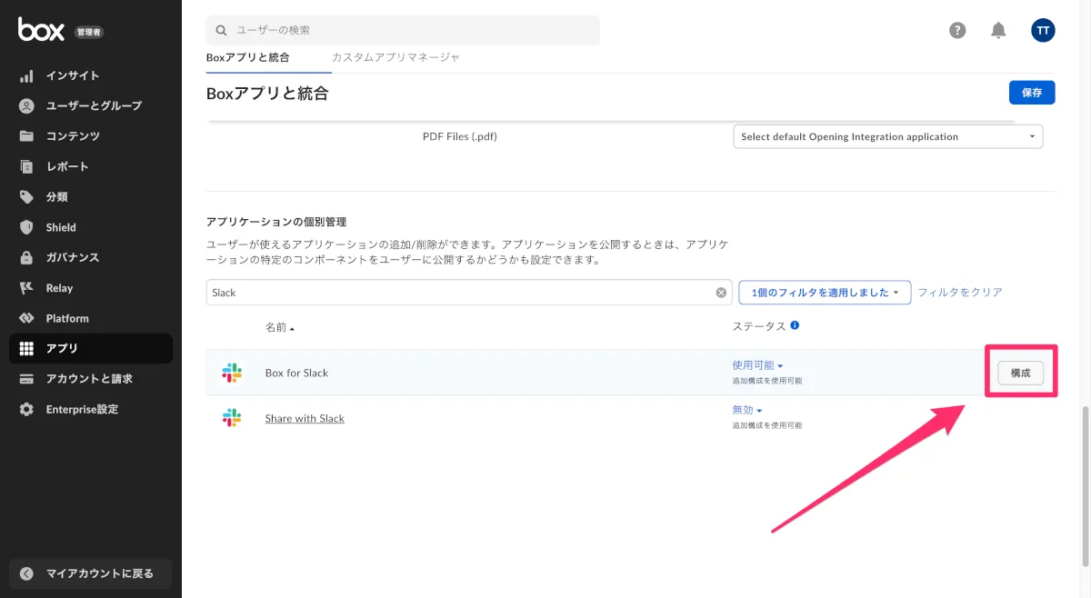 4) [Box for Slack]の横にある[構成]をクリックします。