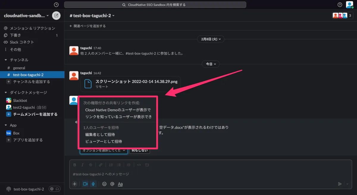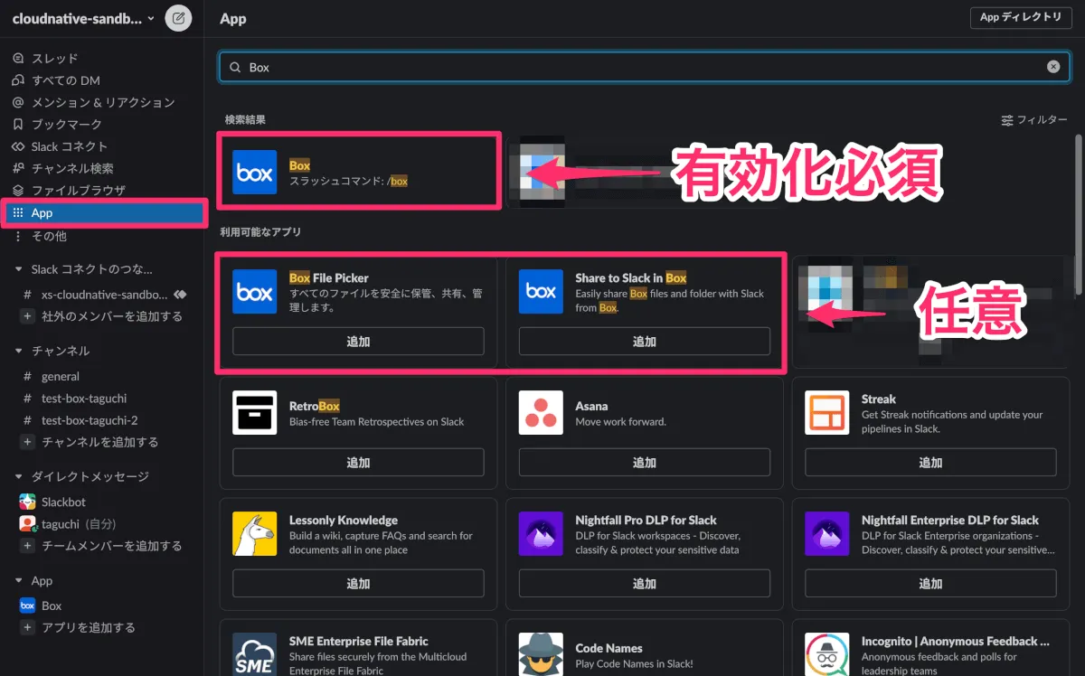 - ただし、「Slack for Box」のアプリを有効化していないユーザーには招待されない