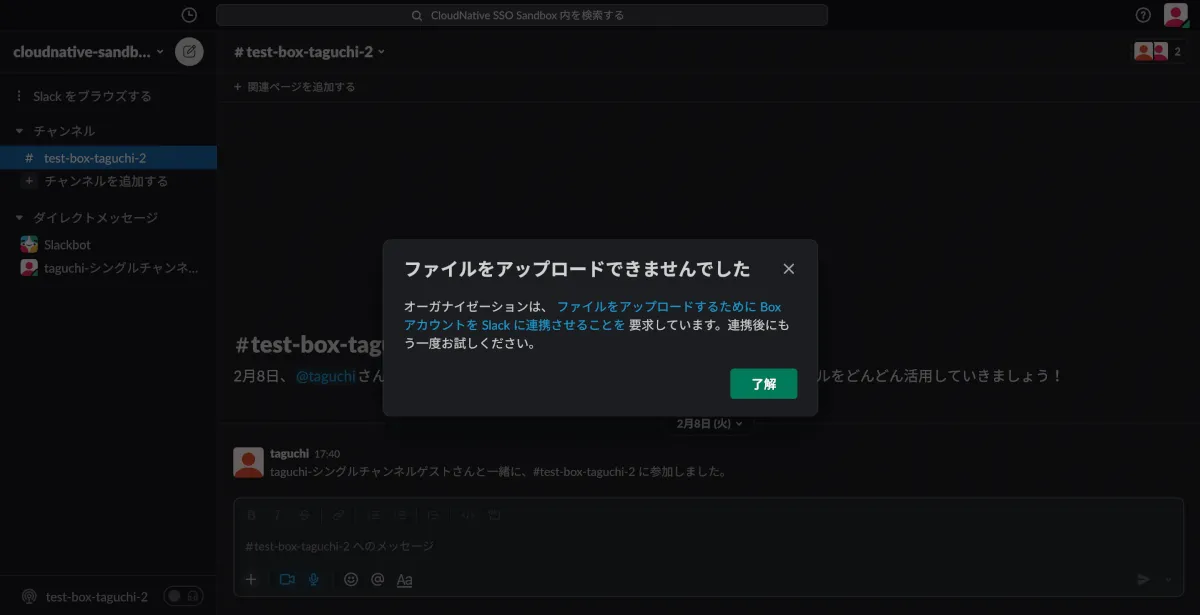 この機能では、ファイルをアップロードするために、Boxアカウントをユーザー単位で、Slackに連携させることを必要としています。そのため、Boxのライセンスを持っていないユーザーはこの機能を利用することができません。ファイルの投稿を実施しようとすると、以下の様にブロックされてしまいます。