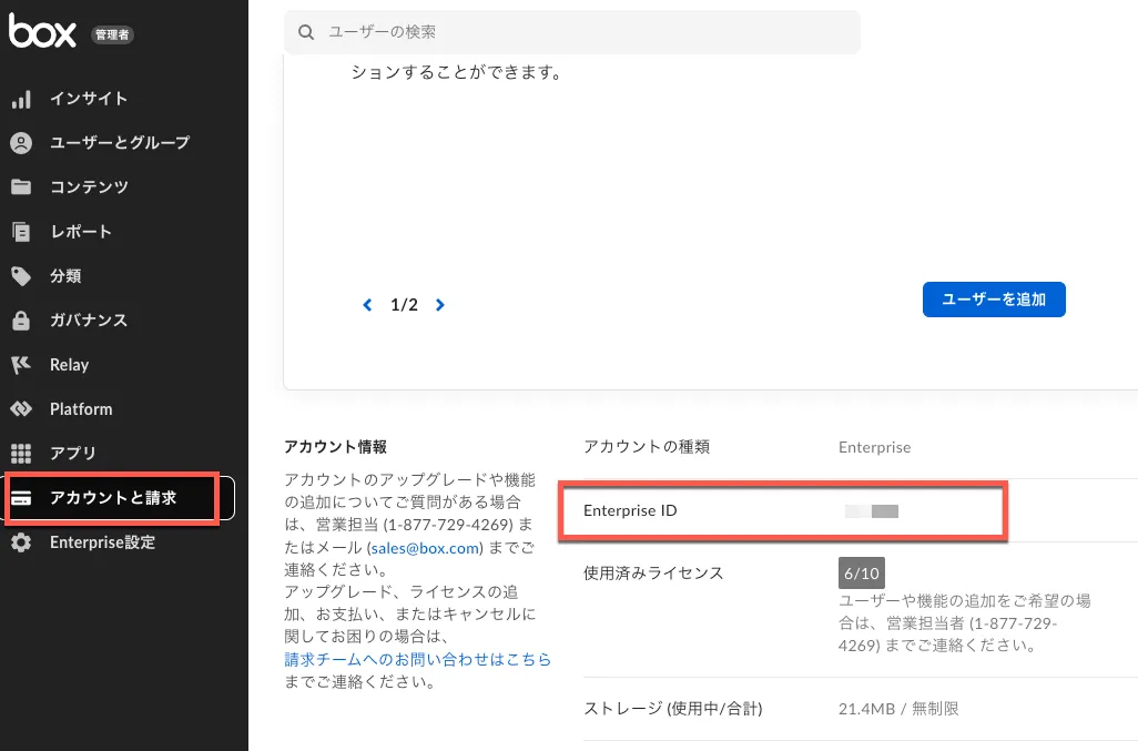 ちなみに、BoxのEnterprise IDは管理コンソールの [アカウントと請求] から確認できます。