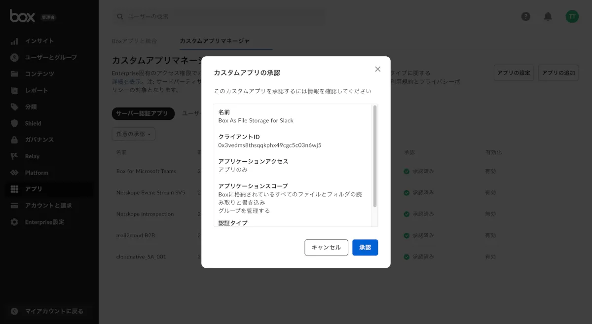 次に、Boxでカスタムアプリを有効にすることで、「Box for Slack: Custom Files Store」のBox側の設定を有効化します。(参考)