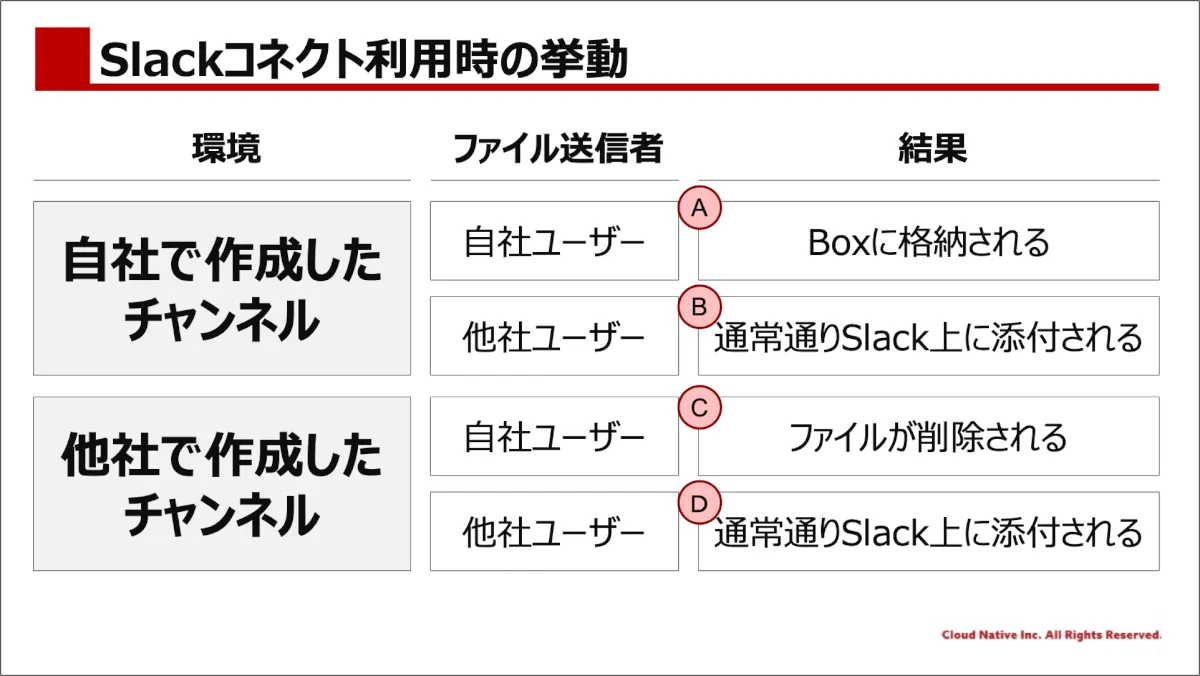 一方、「他社」で作成したチャンネルを利用して、Slackコネクトを利用している場合、自社ユーザーからのファイル共有はSlack上から削除されBoxにも格納されません(上記Cパターン)が、他社ユーザーからのファイル共有は、通常通り添付されます(上記Dパターン)。