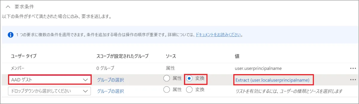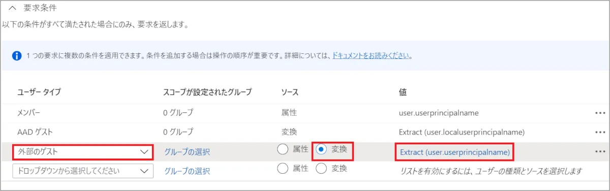 ⑥ 要求条件から、ユーザータイプ [自社ユーザー・他社 Azure AD ユーザー・外部ユーザー] 毎にクレーム条件を設定。