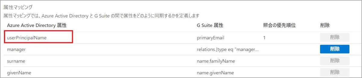 ⑤ [属性マッピング] > [Azure Active Directory 属性] が “userPrincipalName” の行を選択。
