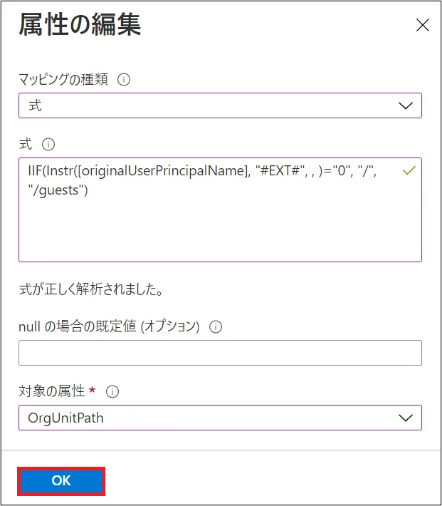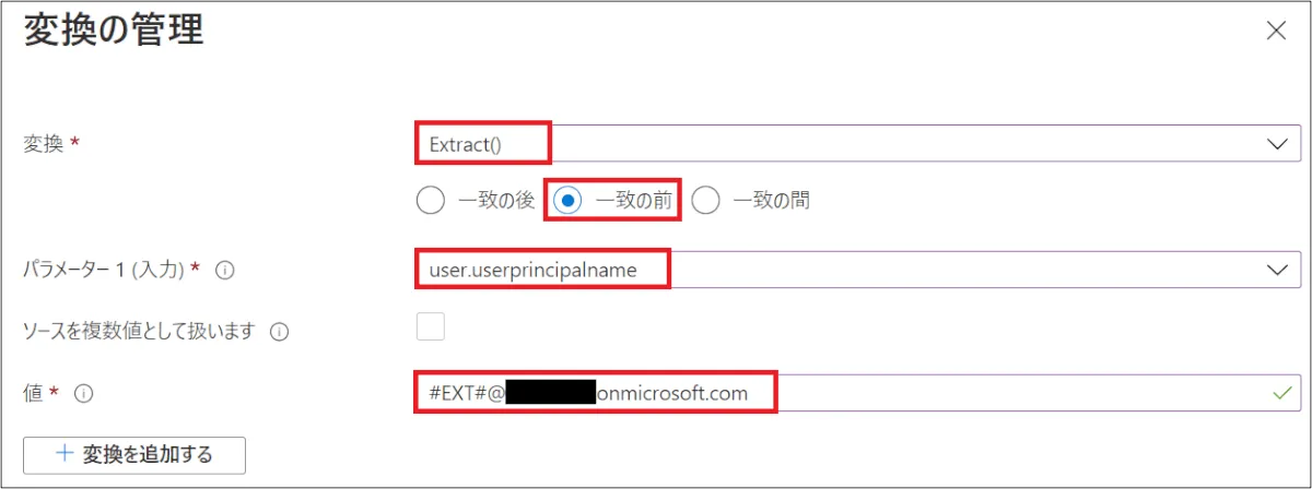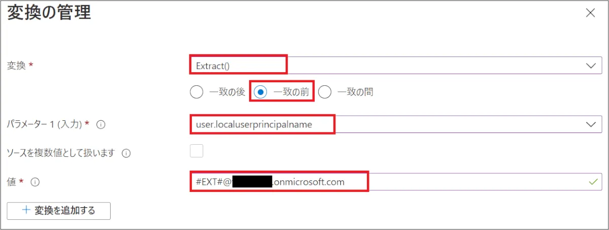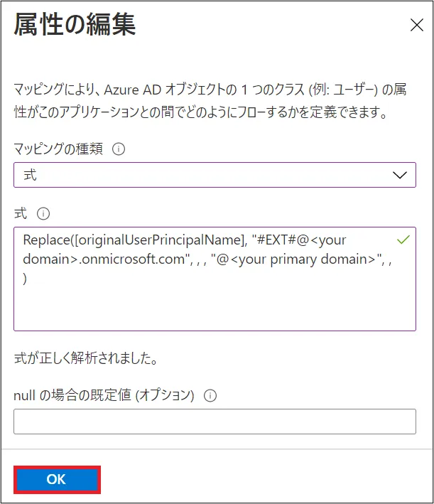 - 式:Replace([originalUserPrincipalName], “#EXT#@<your domain>.onmicrosoft.com”, , , “@<your primary domain>”, , )