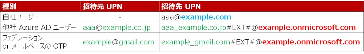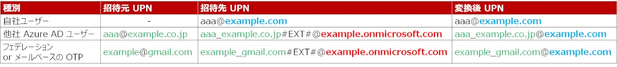 下表は、ゲストアカウントの招待元 UPN と、招待先(自社テナント)で設定される UPN を記載しています。