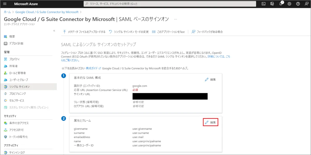 ③ [シングル サインオン] を選択し、[属性とクレーム] > [編集] をクリック。