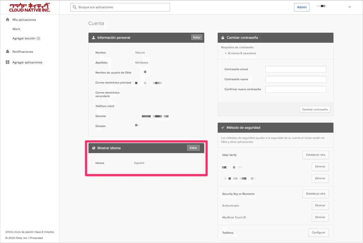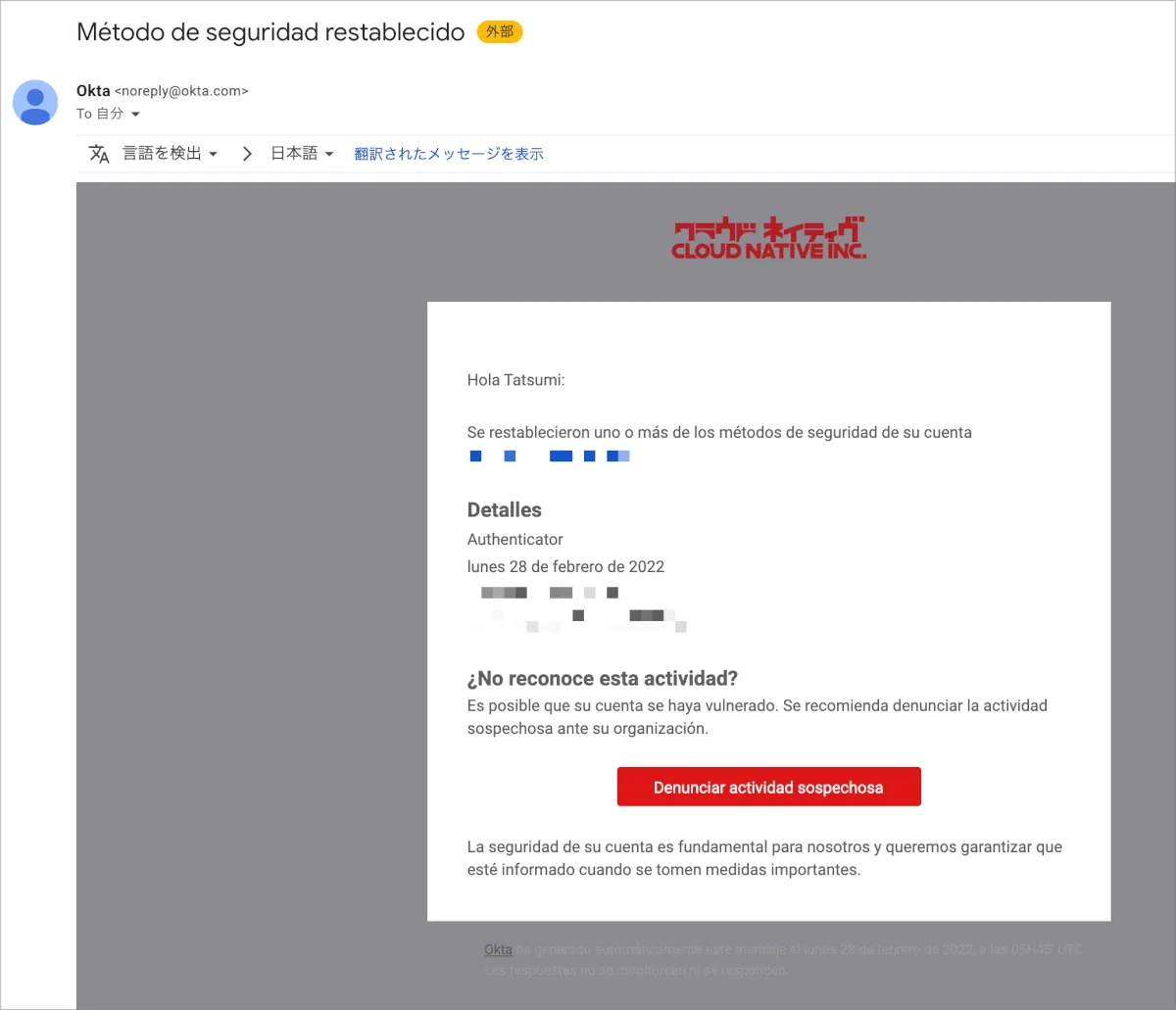 このユーザーがOktaから受け取るメールは下記のように個人が設定した言語であるスペイン語となります。この例ではユーザーがMFAリセットを行ったための確認メールがスペイン語で送付されています。