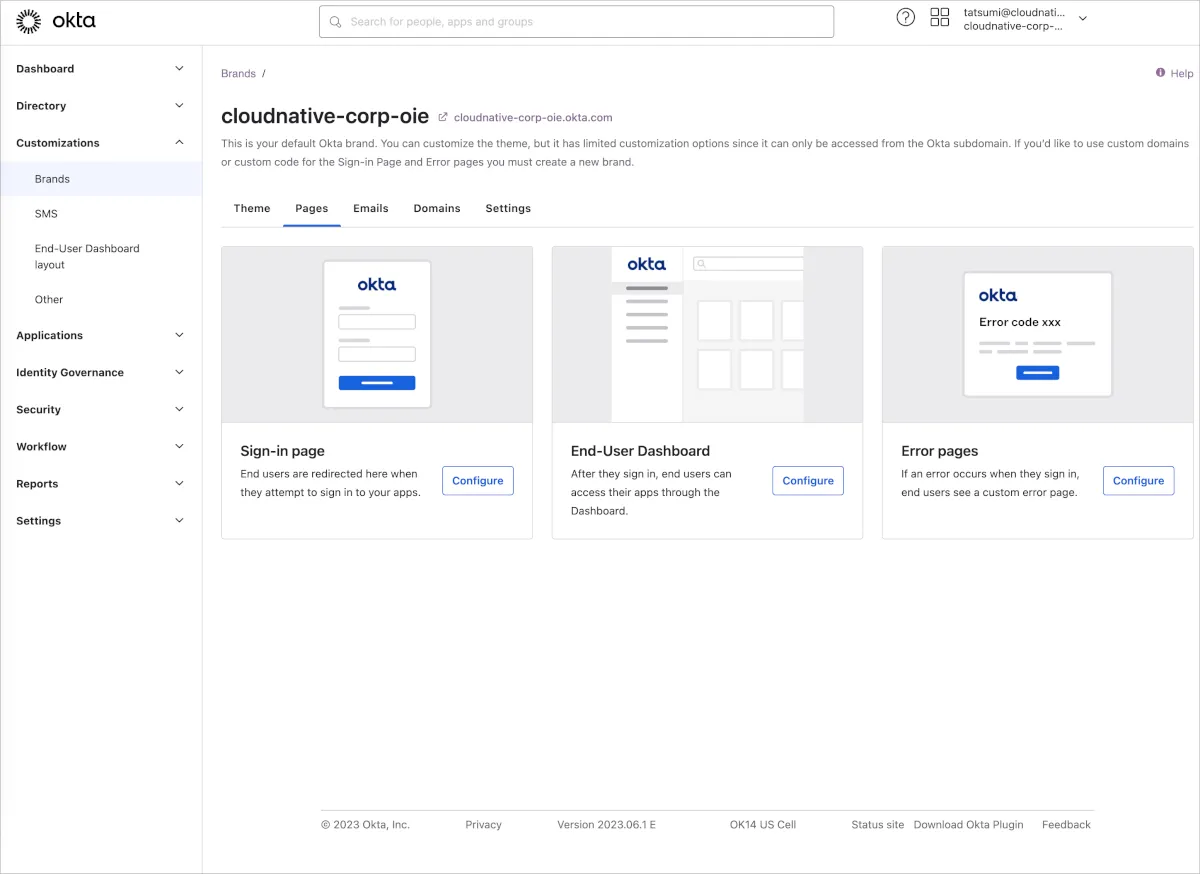 - PagesタブでSign-In PageやEnd-User DashboardそしてError pagesそれぞれのConfigureをクリックし、2.で作成したThemeを適用します。
