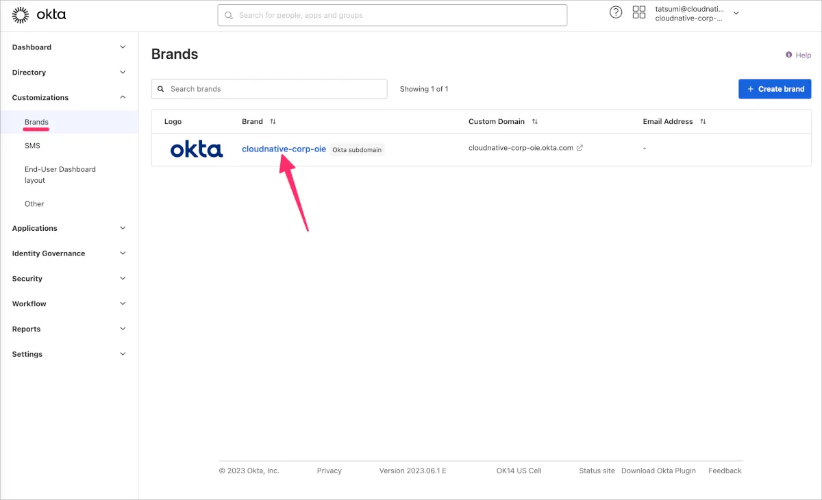 - Okta管理画面のCustomizations>Brandsへ移動し、変更するサブドメイン名をクリックします。