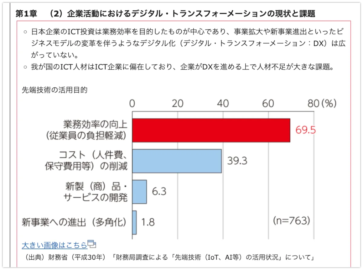 別の側面から見てみましょう。以下は令和3年の情報通信白書からの抜粋ですが、業務効率の向上とコストの削減が大部分を占めています。ただし、括弧書きの中を見るとわかる通り、”人”にまつわる効率化をしたいという共通点があります。