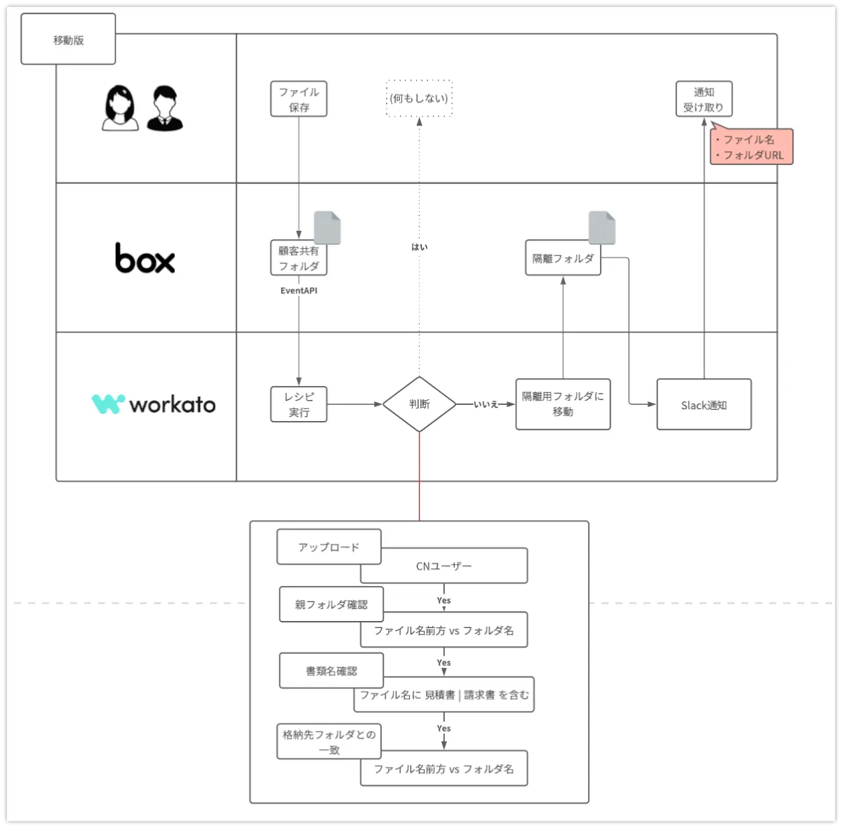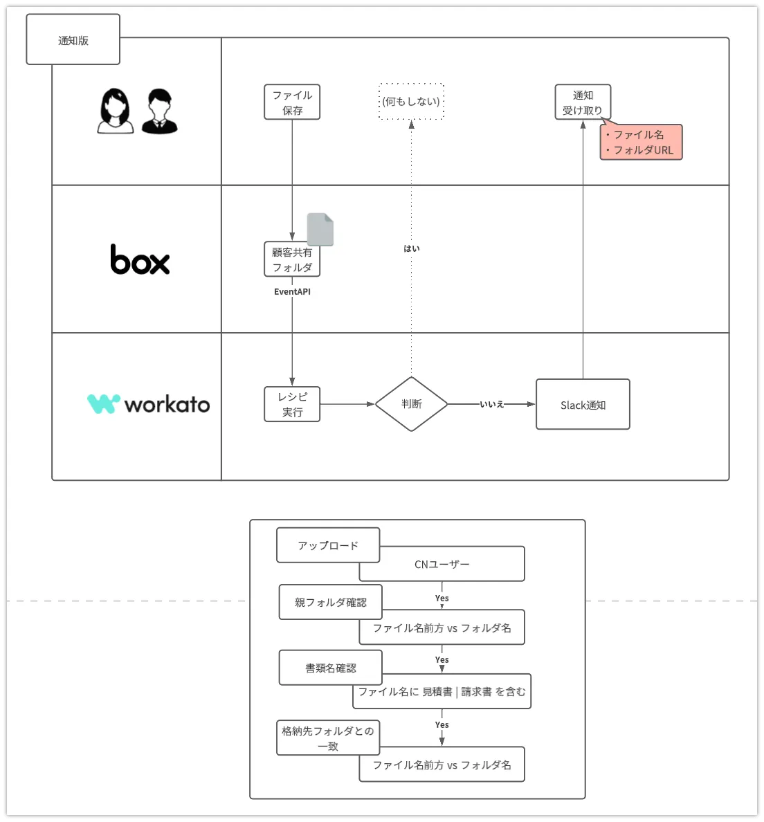 動作はシンプルです。WorkatoがBoxのフォルダ名と保存するファイル名を照合し、一致していないファイルについて、Slackへの通知を行います。