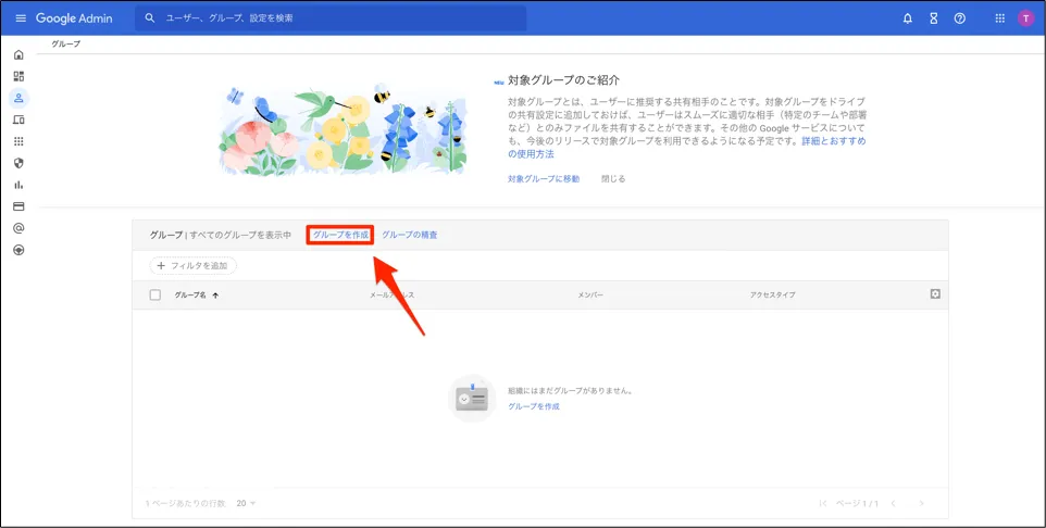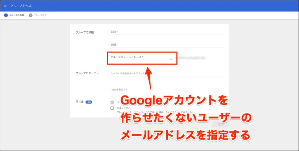 2. Google グループを作成し、「Googleアカウント作成を抑制したいメールアドレス」をグループのメールアドレスに指定する。