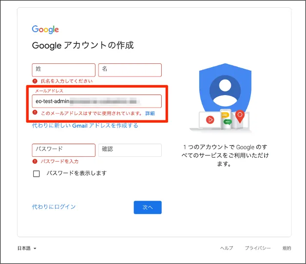 以下の画像の通り、「このメールアドレスはすでに使用されています。」というエラーメッセージが届き、ユーザーはアカウント作成することがでないようになります。