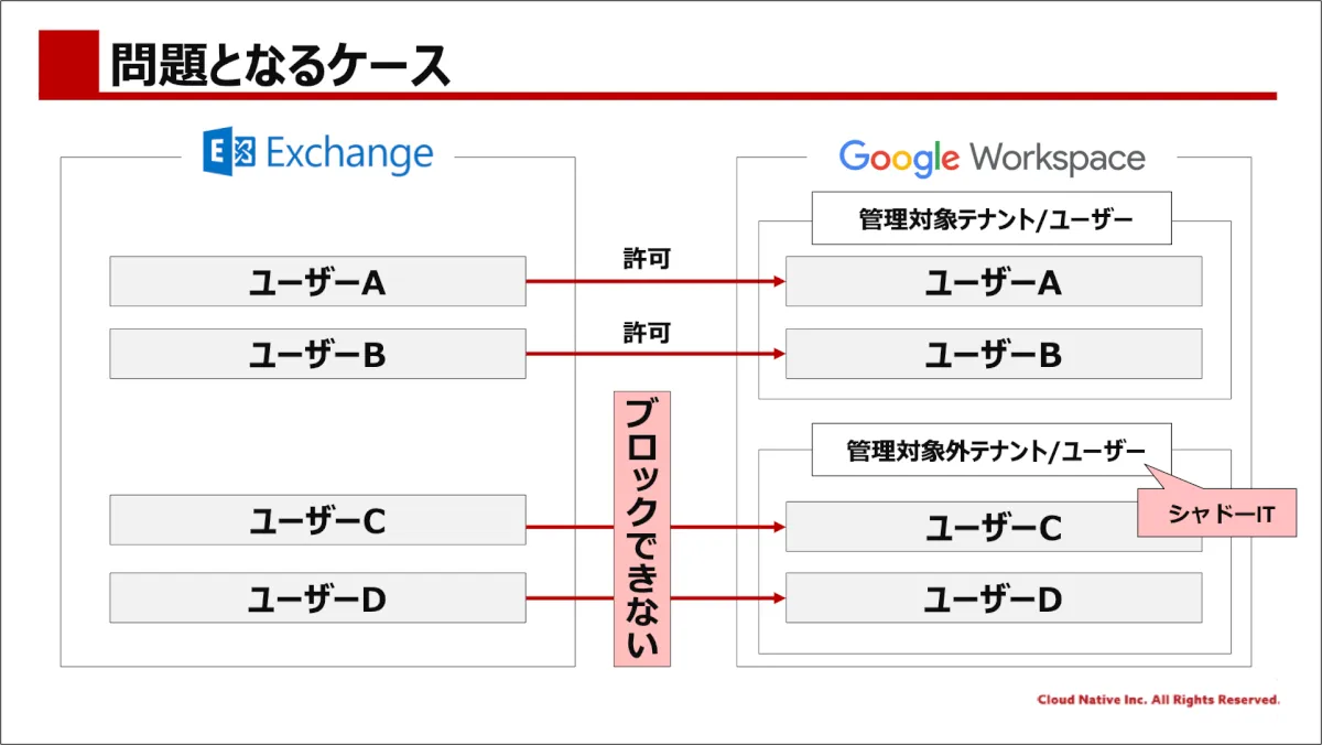 シンプルに対処するためには全従業員のGoogle Workspaceに対する通信を検疫するか、完全ブロックしてしまえばいいのですが、特に困るユースケースとしては、上記のようにExchangeを利用しているが、業務上の理由で一部のユーザーのみGoogle Workspaceを利用させる場合です。