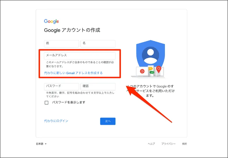 Googleアカウントは、新規にメールアドレスを発行して作成するのが主流な一方で、既存のメールアドレスを指定して、アカウント作成が可能です。そのため、Exchange等の自社ドメインアドレスを利用して、Googleアカウントを作ることができます。