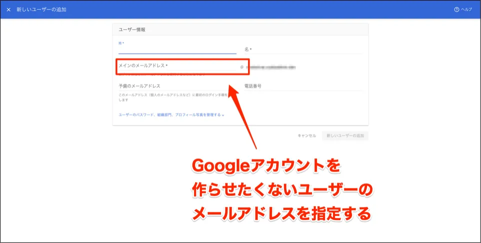 2. Cloud Identity Freeのサブスクリプションを用いて、「Googleアカウント作成を抑制したいメールアドレス」のユーザーを作成する。