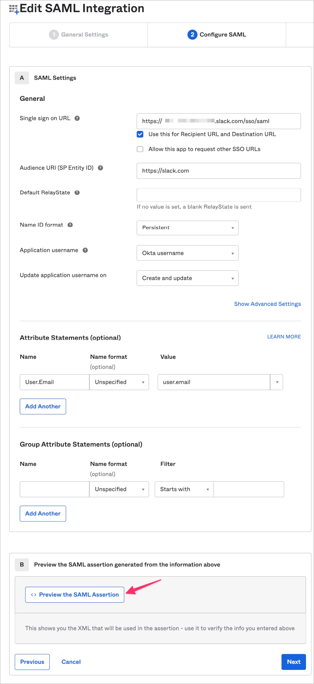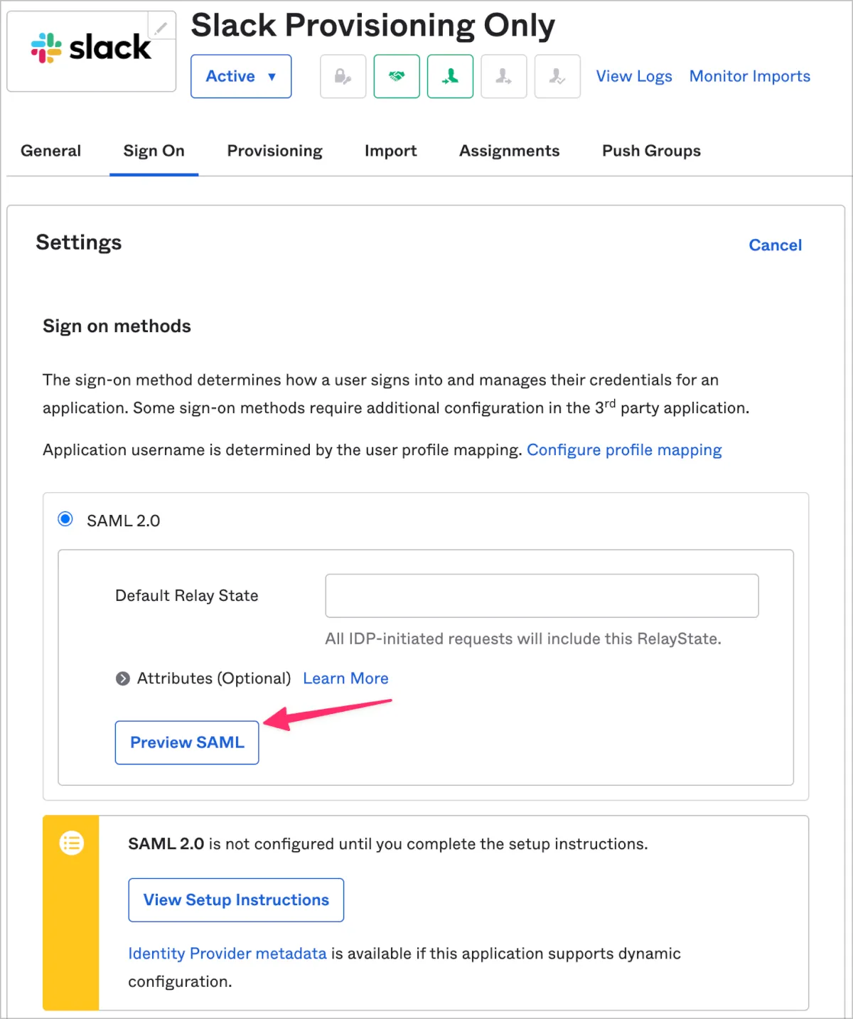 テンプレートから作成したアプリケーションであるSlack Provisioning OnlyのSign OnタブのSettingsからEditをクリックして編集状態にし、Preview SAMLをクリックします。