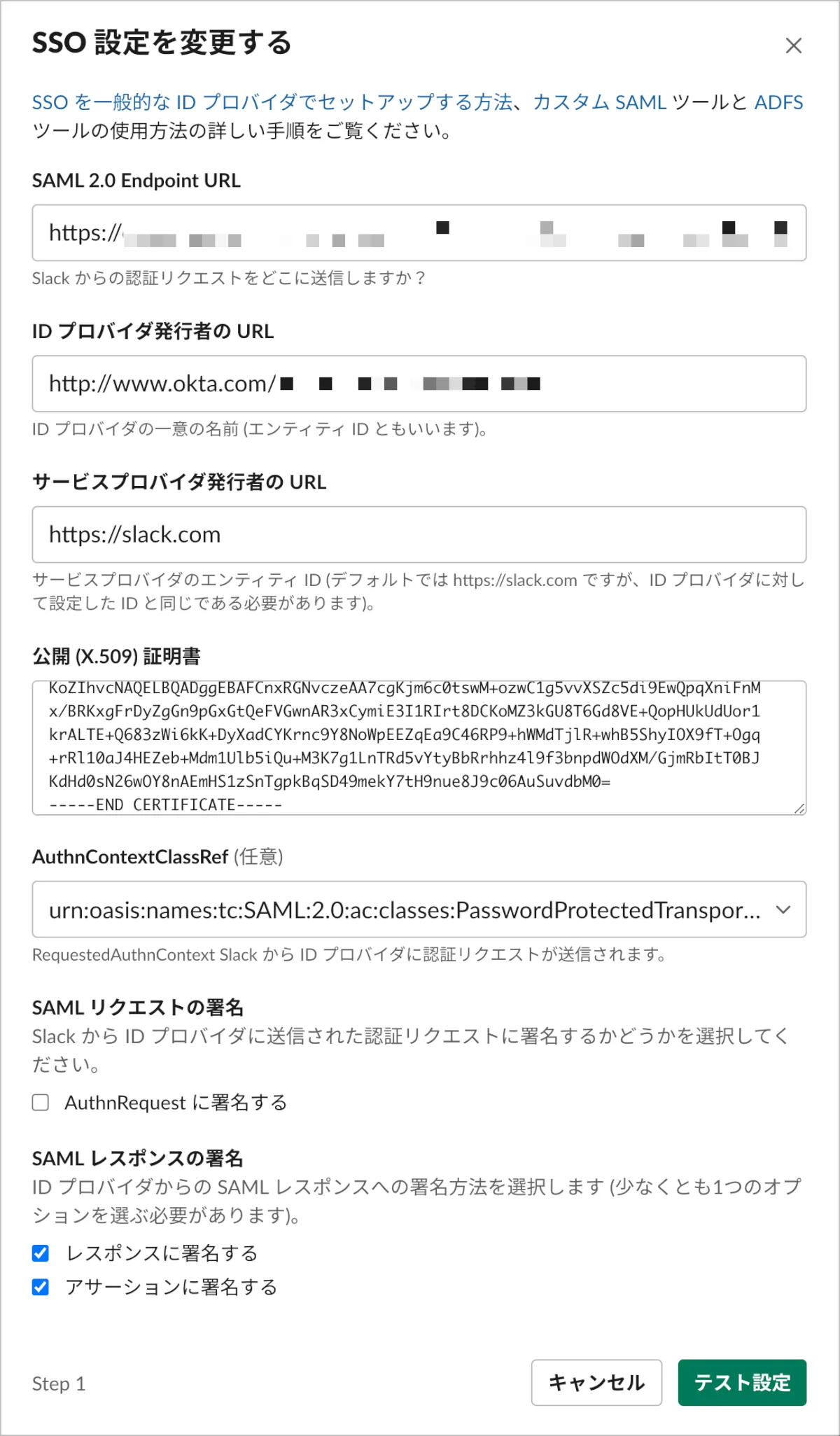 - SlackのSSO設定画面を開き、6.で確認した値をフォームに入力します。