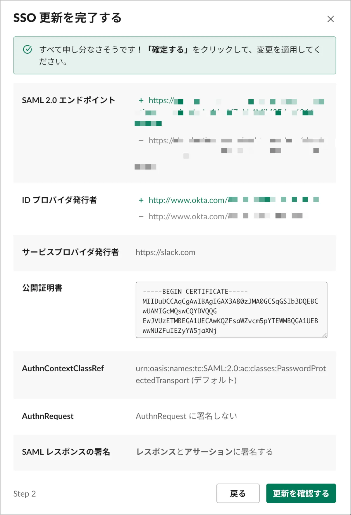 この時点で「更新を確認する」はクリックしないでください。クリックすることで既存のアプリケーションから新規作成したアプリケーションへ認証が切り変わるためです。テスト完了後にOkta側で新規作成したアプリケーションにユーザーをアサインしたあとで切り替えを行う必要があります。