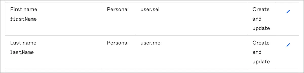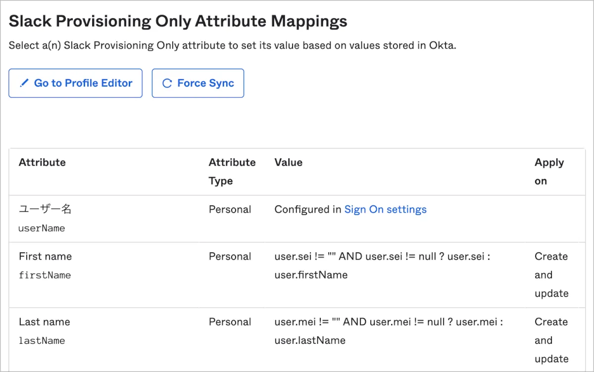 Slack上の氏名はAttributeのFirst nameとLast name半角スペースで連結したものが反映されます。今回は漢字で苗字 名前の並びにするために通常の意味とは逆になりますが、First nameにuser.seiをLast nameにuser.meiを指定しています。