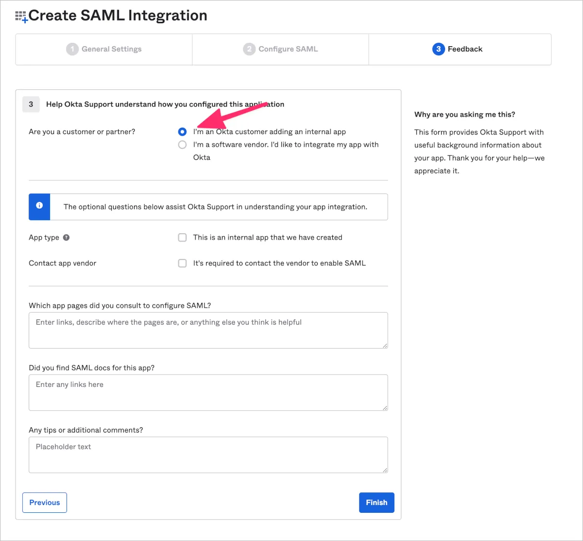 - Are you a customer or partner?にI’m an Okta customer adding an internal appにチェックを入れ、Finishをクリックします。