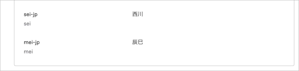 では漢字はどこに格納したらいいかというと、Profile Editorからカスタム属性として作成してみました。表示名はsei-jpとmei-jpとなっていますが、内部的な項目名はuser.seiとuser.meiとして作成しました。