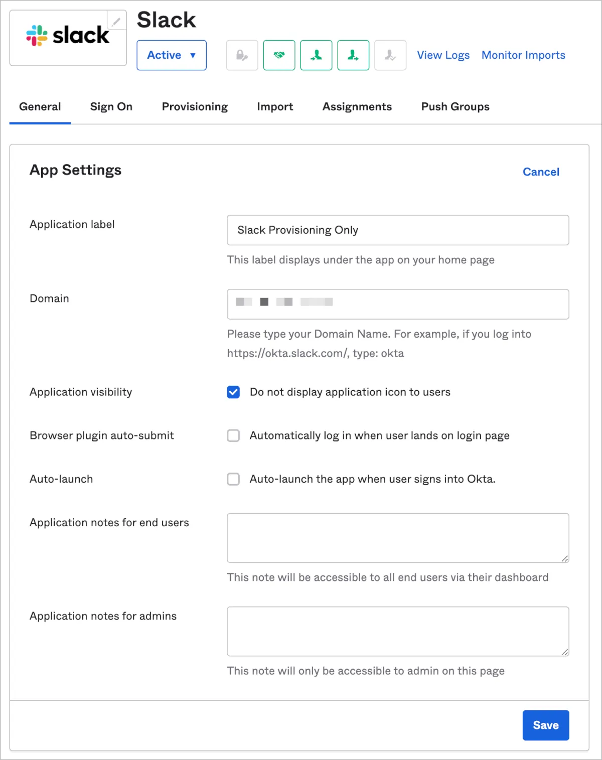 - Applicatin labelをSlack Provisioning Onlyなどわかりやすい名前に変更します。
