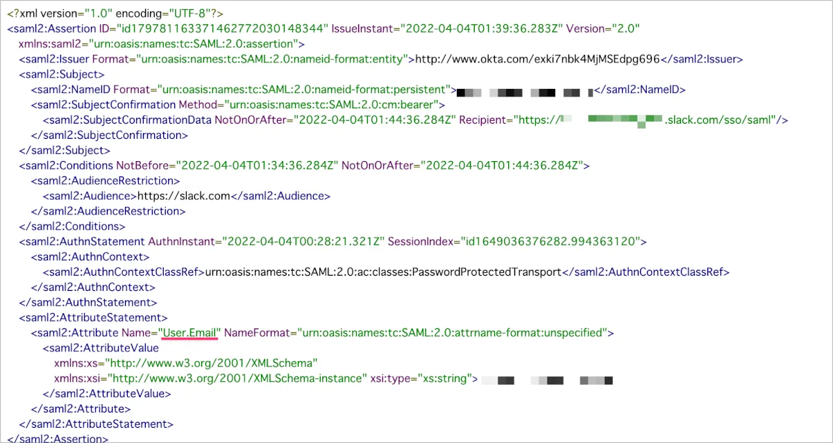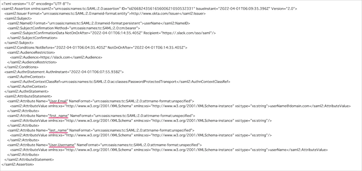 この中で下線を引いた内容がSSO時にSlackに渡される属性値です。User.Email,first_name,last_name,User.Usernameの4つが渡されていることがわかります。