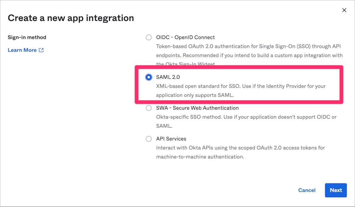 - Create App IntegrationからSAML2.0を選択し、Nextをクリックします。