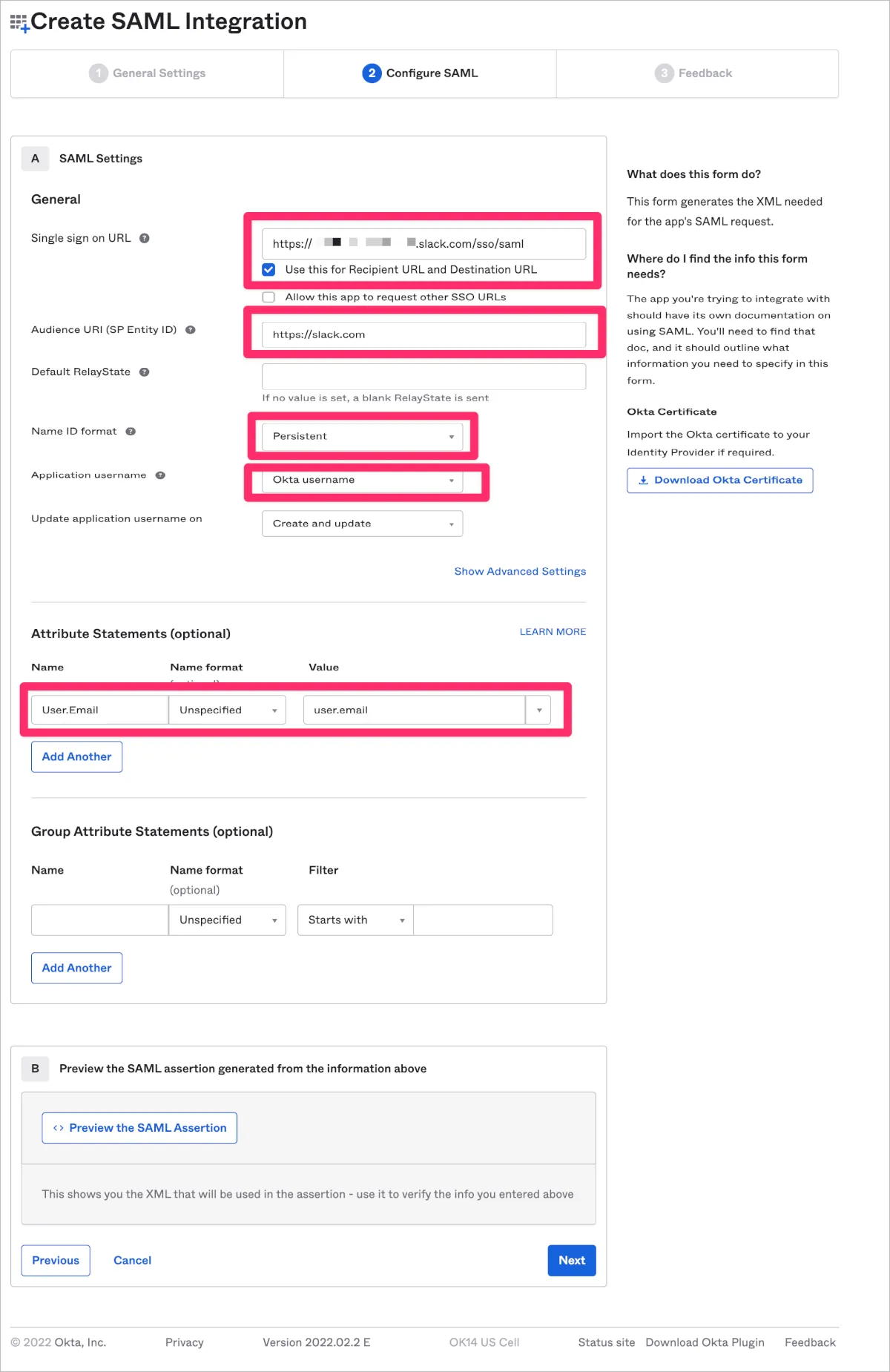 Single sign on URLには、https://<yourdomain>.slack.com/sso/saml(Enterprise Gridの場合はOrgレベルのURLhttps://<yourdomain>.enterprise.slack.com/sso/samlを指定します)