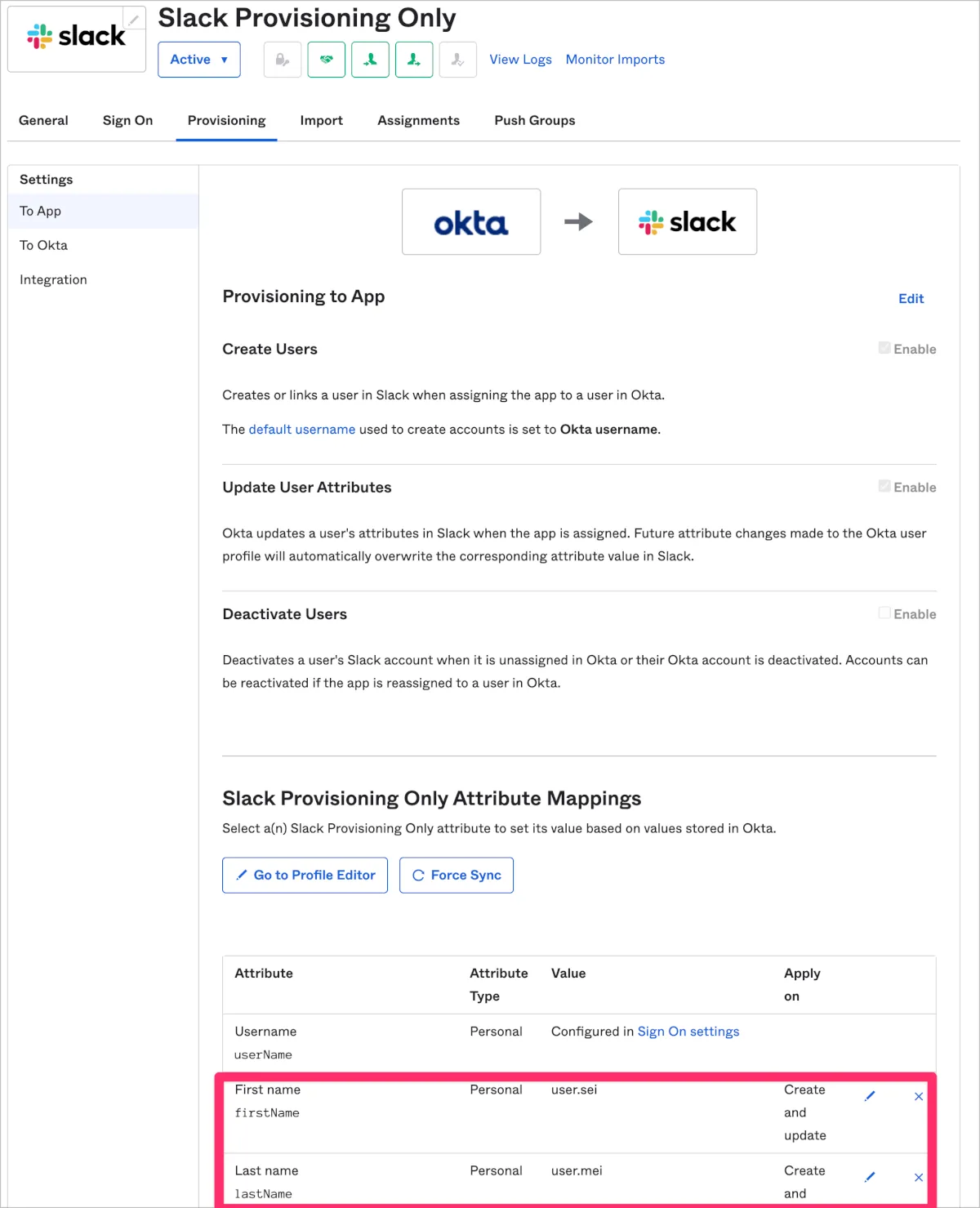 - Provisioningタブに移動し、OktaからSlackに対するAttribute MappingのFirst nameおよびLast nameを任意のAttributeに変更します。