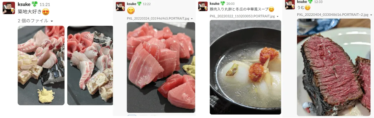 ランチは概ね12時くらいからとられており、半分くらい自分でつくっているそうです。ランチタイムにKsukeさんのSlackのページを見ると、飯テロですよね!というような美味しそうな料理が並んでいます。
