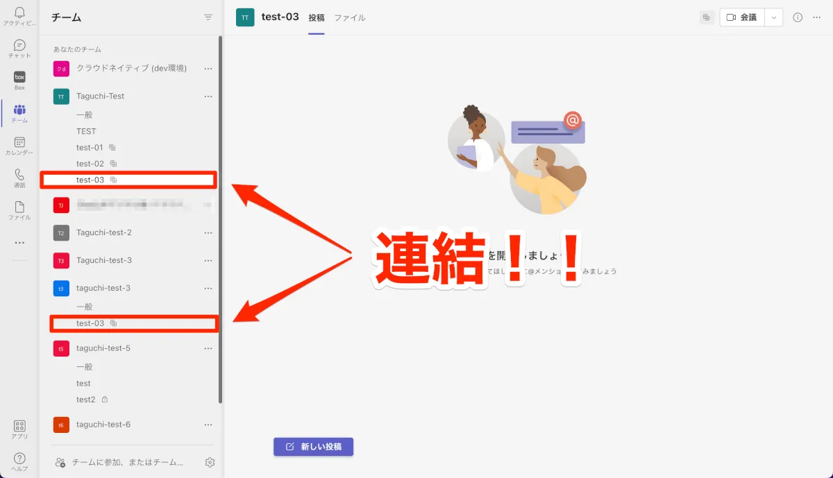 一方、「自分が所属するチームと」というオプションは、端的にいうと「社内のチーム同士を接続する」設定です。下記の図では「taguchi-test」というチームと「taguchi-test-3」というチームを連結しております。