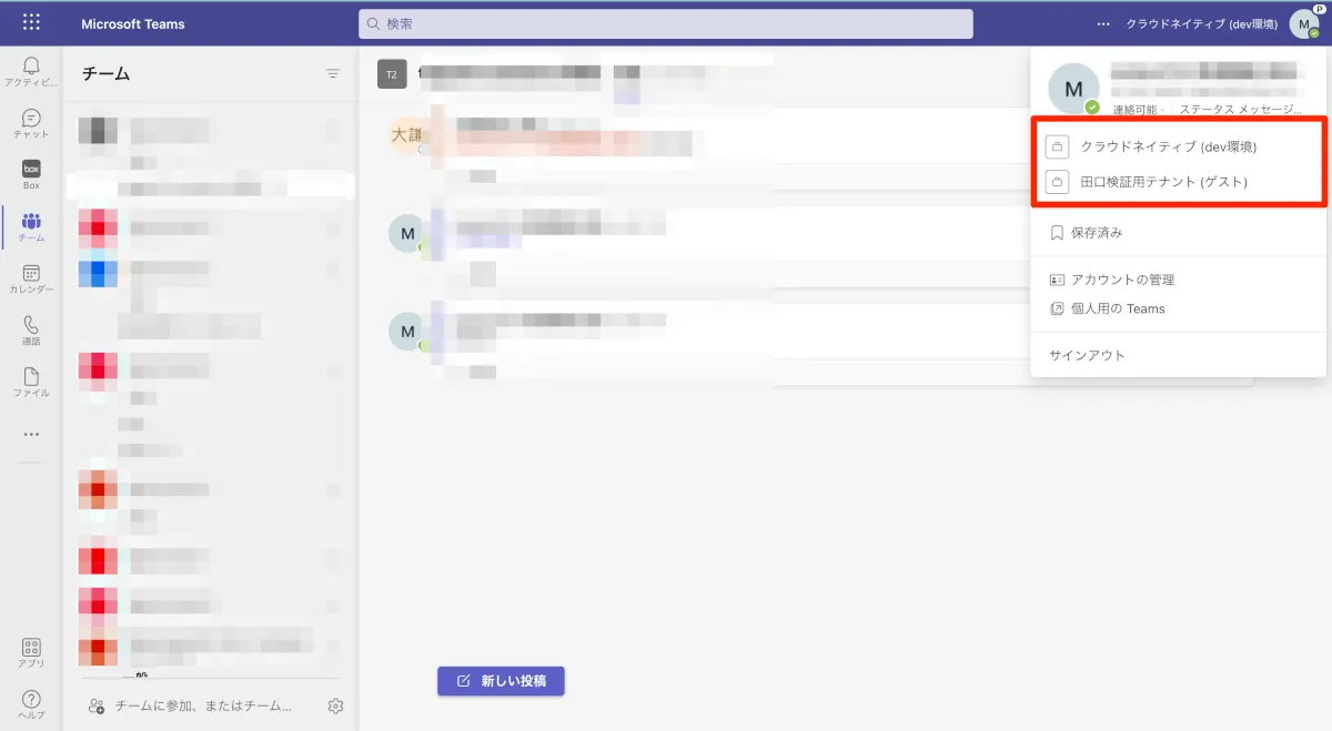 ただ、「ゲストアカウント」は利便性において課題があり、例えばユーザーが「自社Teams(通常アカウント)」と「他社Teams(ゲストアカウント)」の両方を利用している場合は、毎回テナントの切り替えが必要となります。私は前職でTeamsをガンガン利用していましたが、このテナントの切り替えが手間だったのを今でも覚えています。
