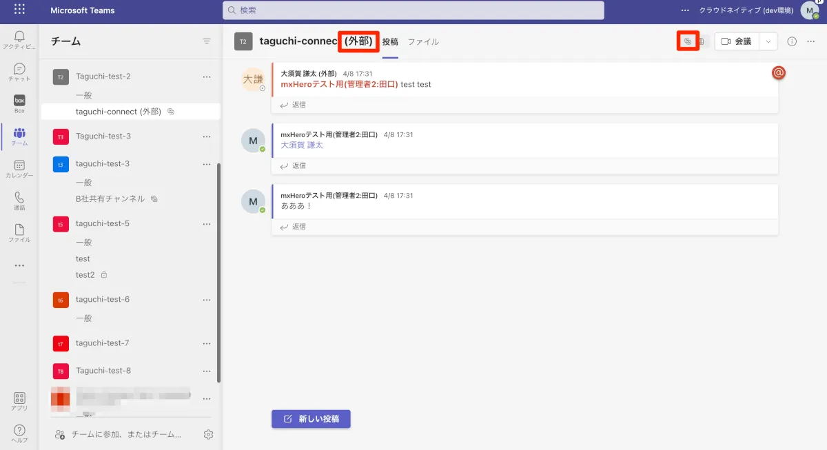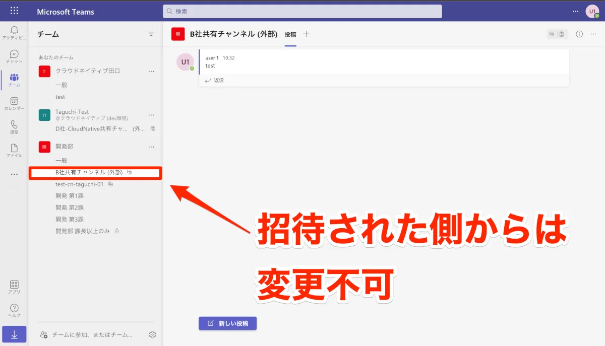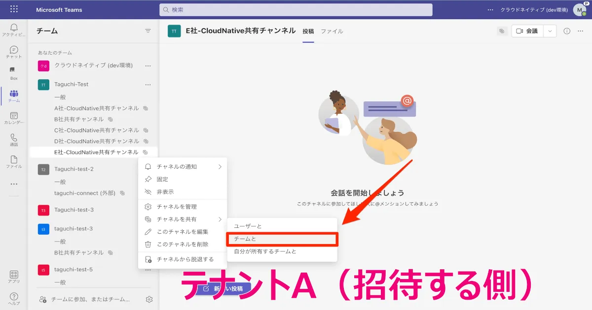 招待する側の目線では、作成したチャンネルに、「テナントB(招待された側)」のユーザーが現れて、チャットを行うことができます。招待された側の目線では、Teams Connectを構成する中で選択したチームに新たなチャンネルが出現し、招待したテナントのユーザーとコミュニケーションを取ることができます。