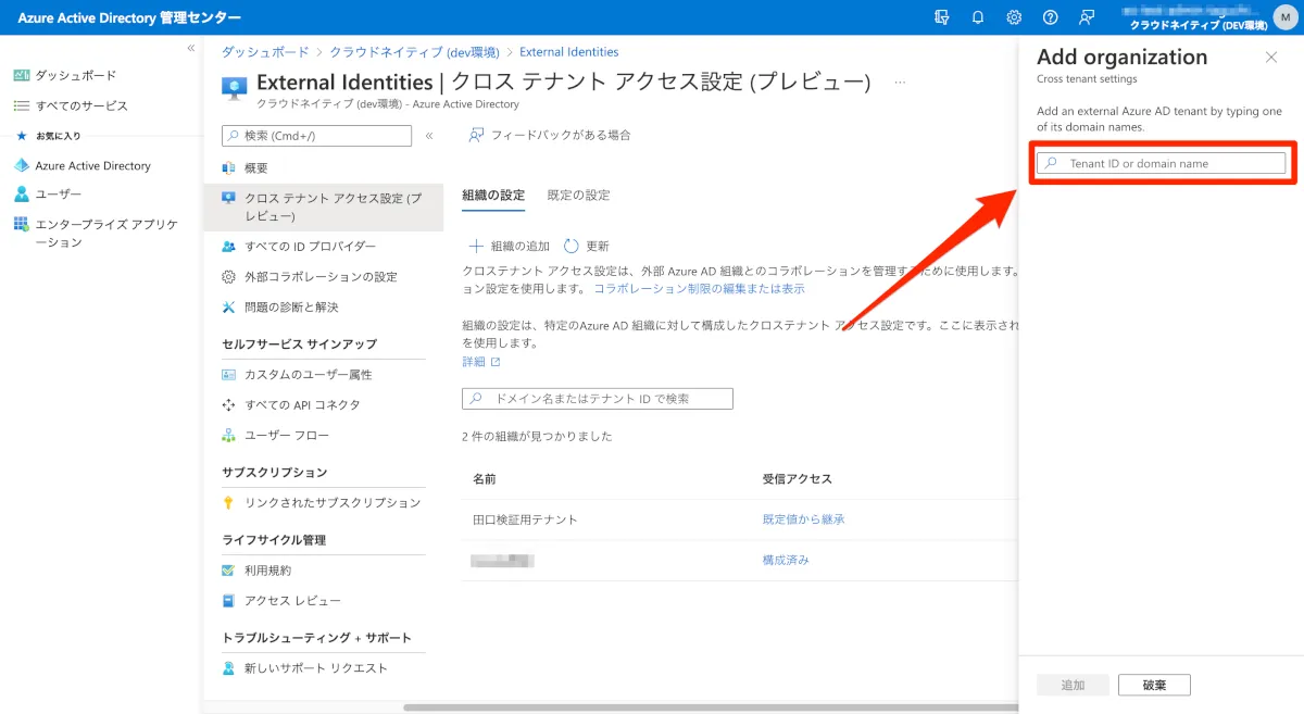 まず、[Azure Active Directory 管理センター] > [External Identities] > [クロステナントアクセス設定] に、コラボレーションする組織を双方の環境で追加します。ここで入力するのはテナントIDか [XXX].onmicrosoft.com といったプライマリドメインです。