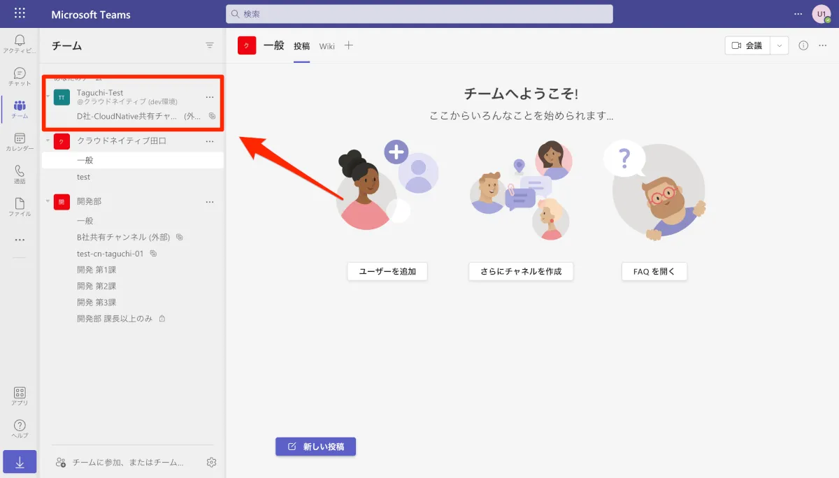 「チームと」の共有は異なる組織のチーム同士をチャンネルを通じて接続しましたが、この「ユーザーと」はユーザー個人をチャンネルに招待する設定です。この設定で招待しても、招待されたユーザーはテナントの切り替えをすることなくアクセスが可能です。