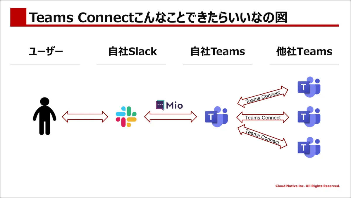 SlackとTeamsの投稿を同期するMio という製品があり、当社でも以前検証してブログにしています。そんなMioを使って、下記の図のように、Slackを利用している組織とTeamsを利用している組織がシームレスにやりとりできる世界がきたらすごく面白いなと考えています。