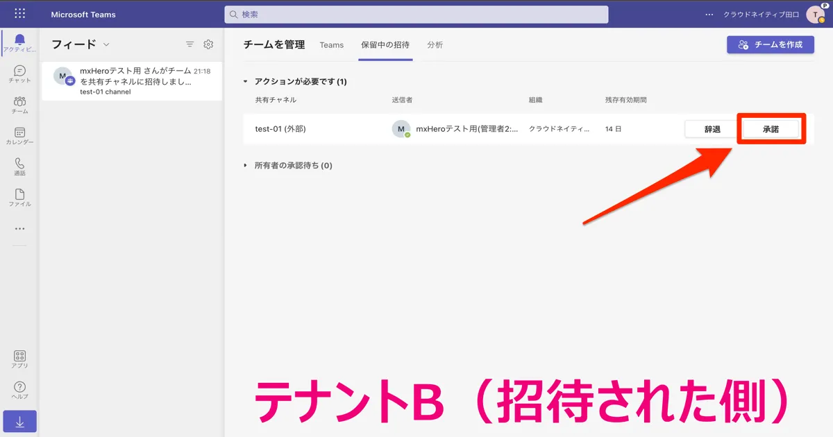 すると、招待された側のテナントに招待をされた旨の通知メッセージが届きます。